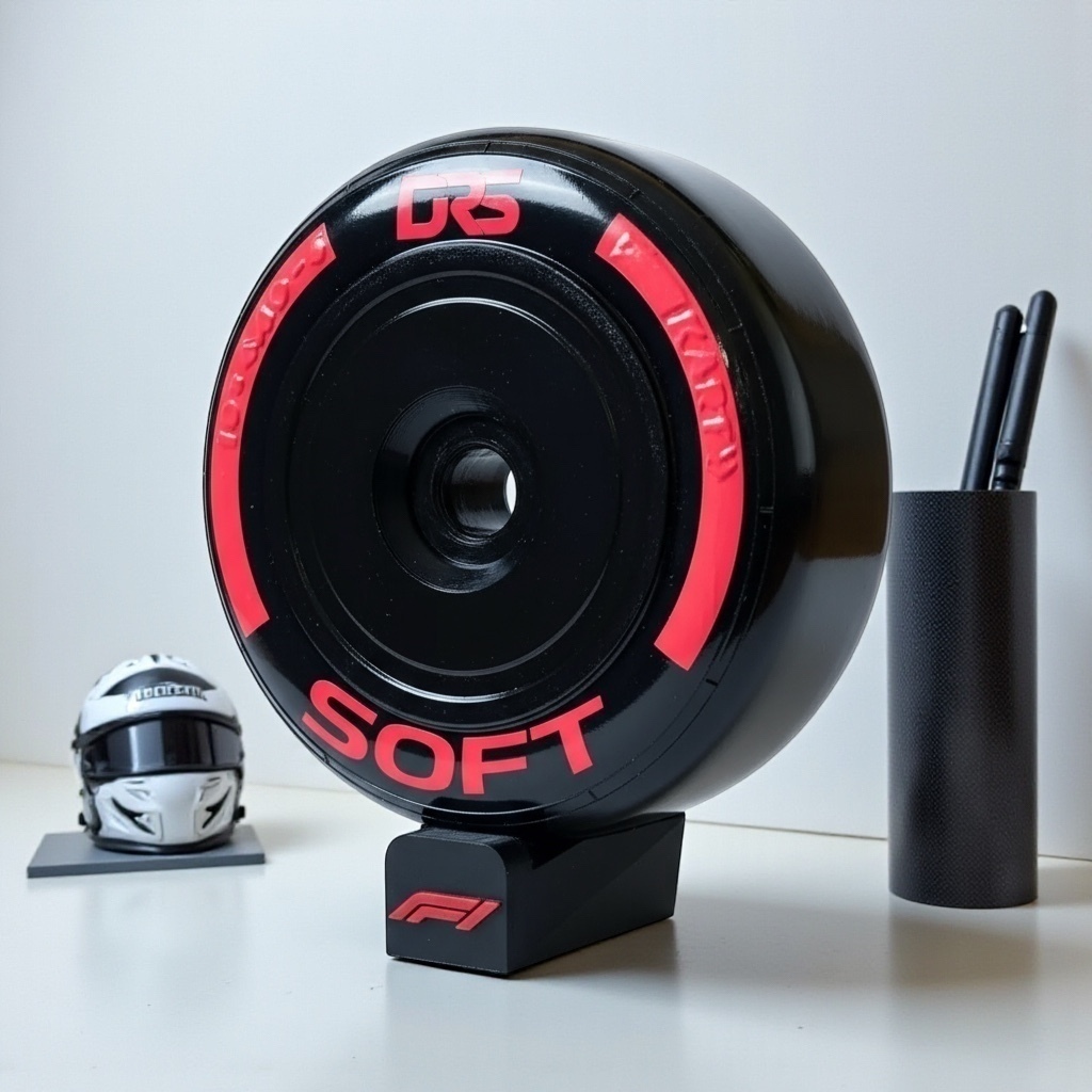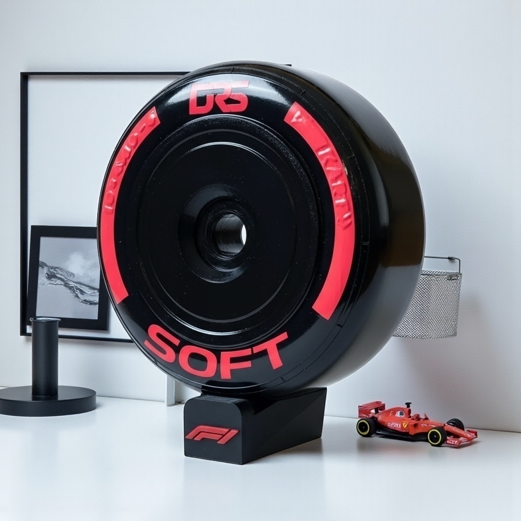 Réplica decorativa de neumático F1 en tamaño 25x25 cm, con llanta en impresión 3D, diseño del compuesto SOFT (blanco) y base de soporte para exhibición.